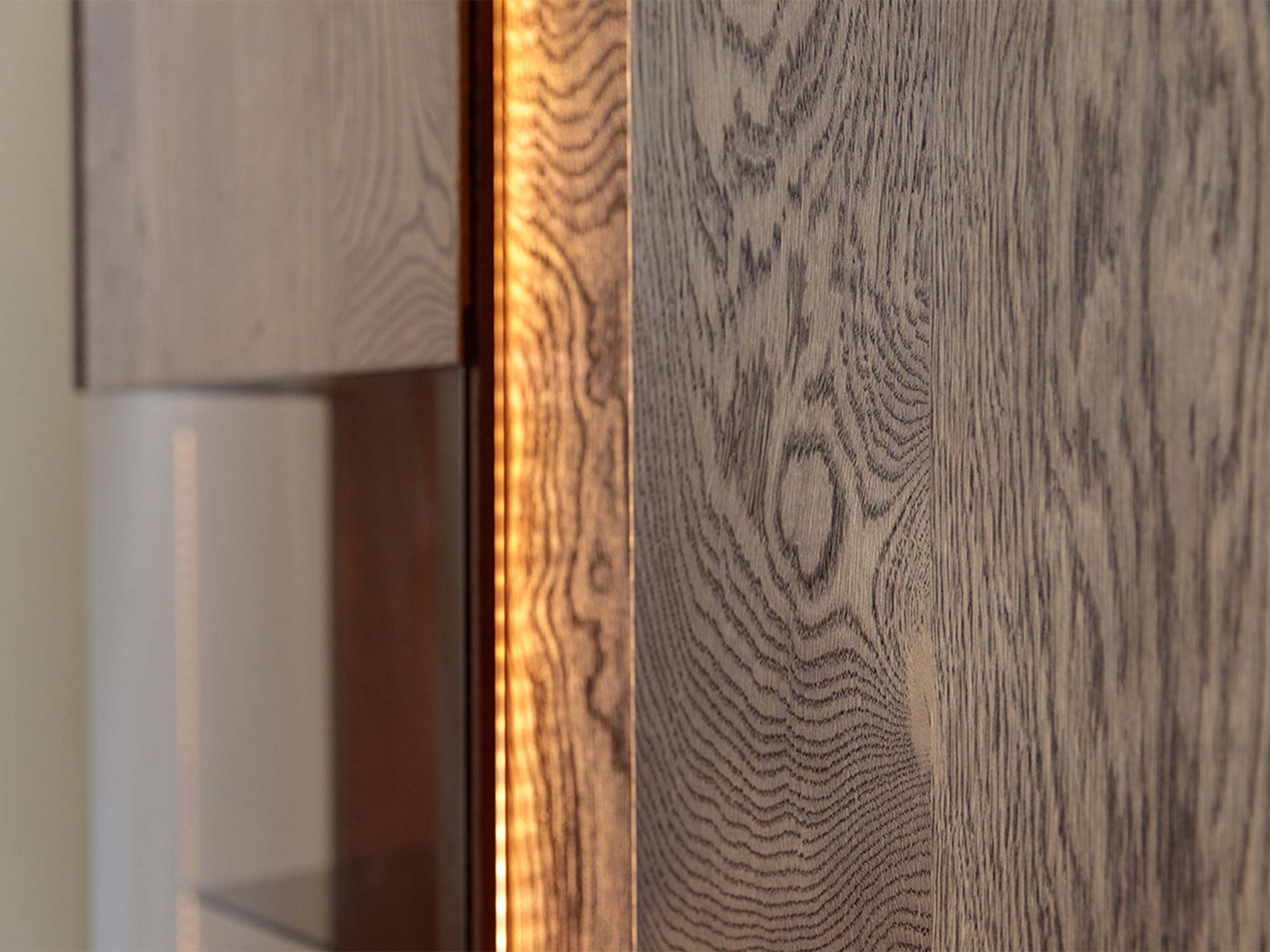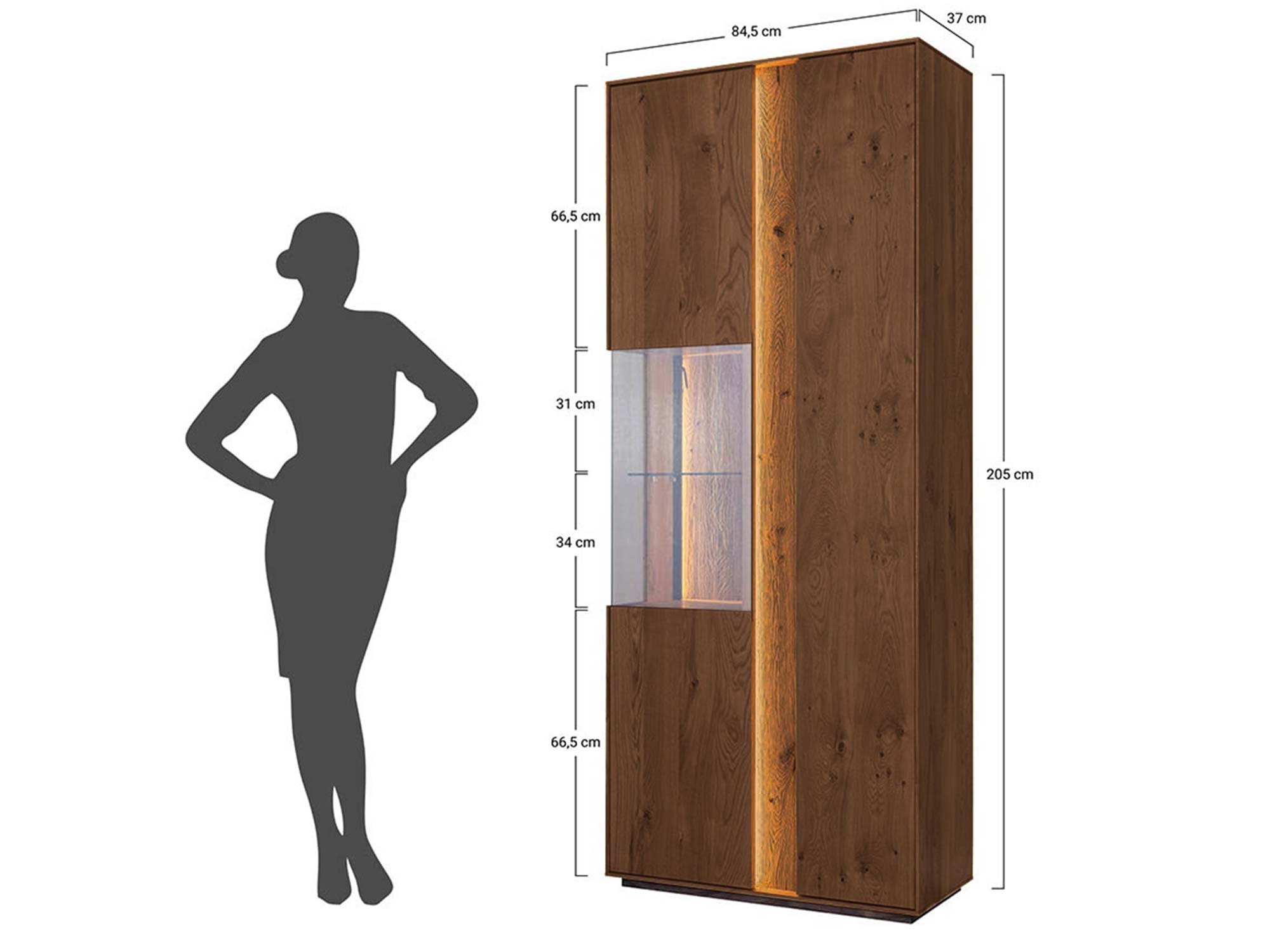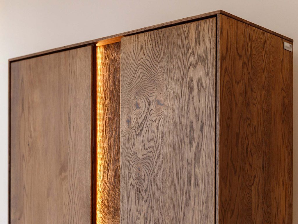 Ta podwójna wersja Essentii przyciąga uwagę i porządkuje przestrzeń. Wysokiej klasy wykończenie olejem wydobywa piękno dębu, a wbudowane oświetlenie LED podkreśla ekspozycję. Dzięki systemowi tip-on drzwi otwierają się lekkim dotykiem — bez uchwytów, bez zbędnych detali, za to z wyraźnym efektem „wow”.