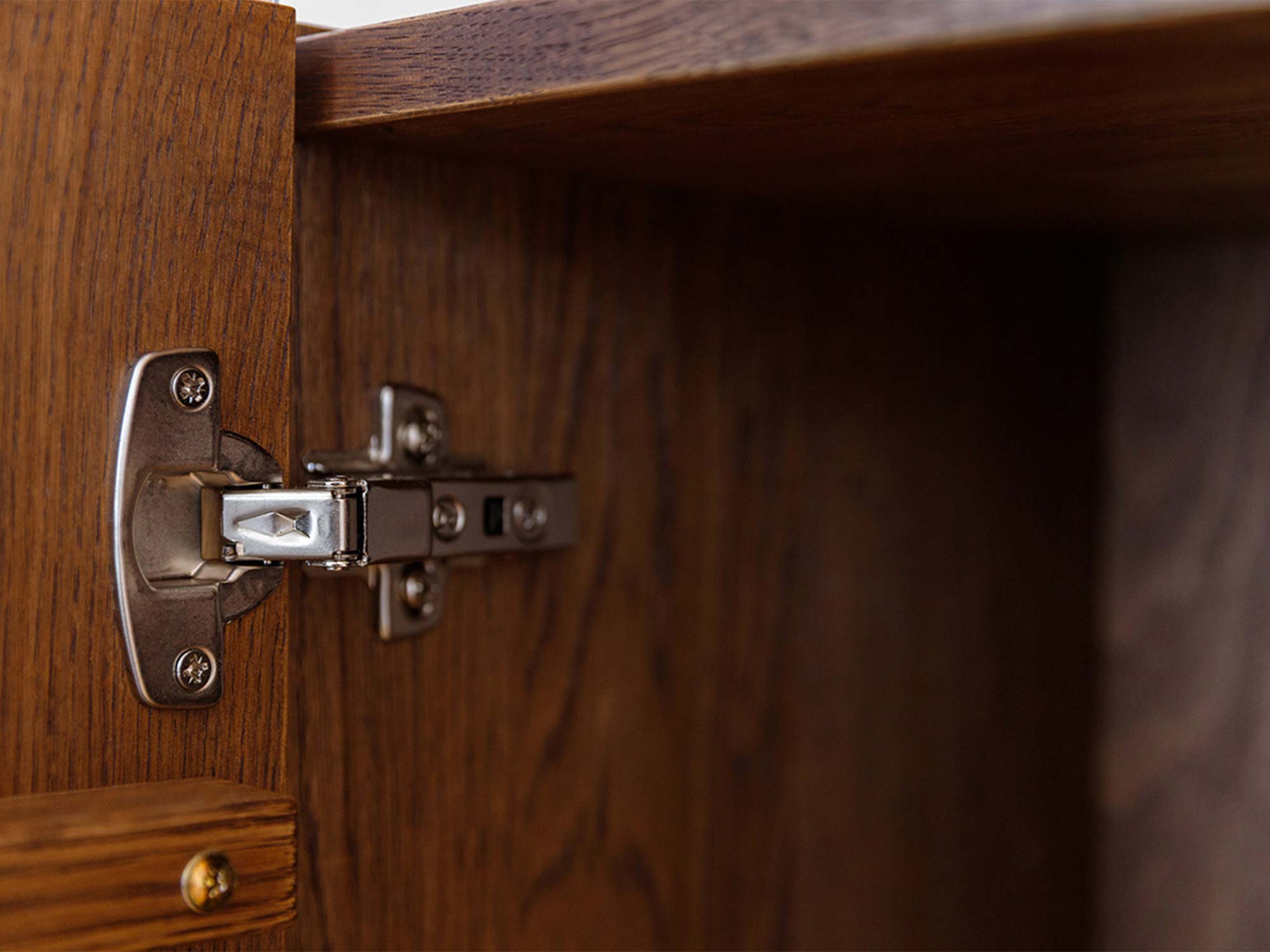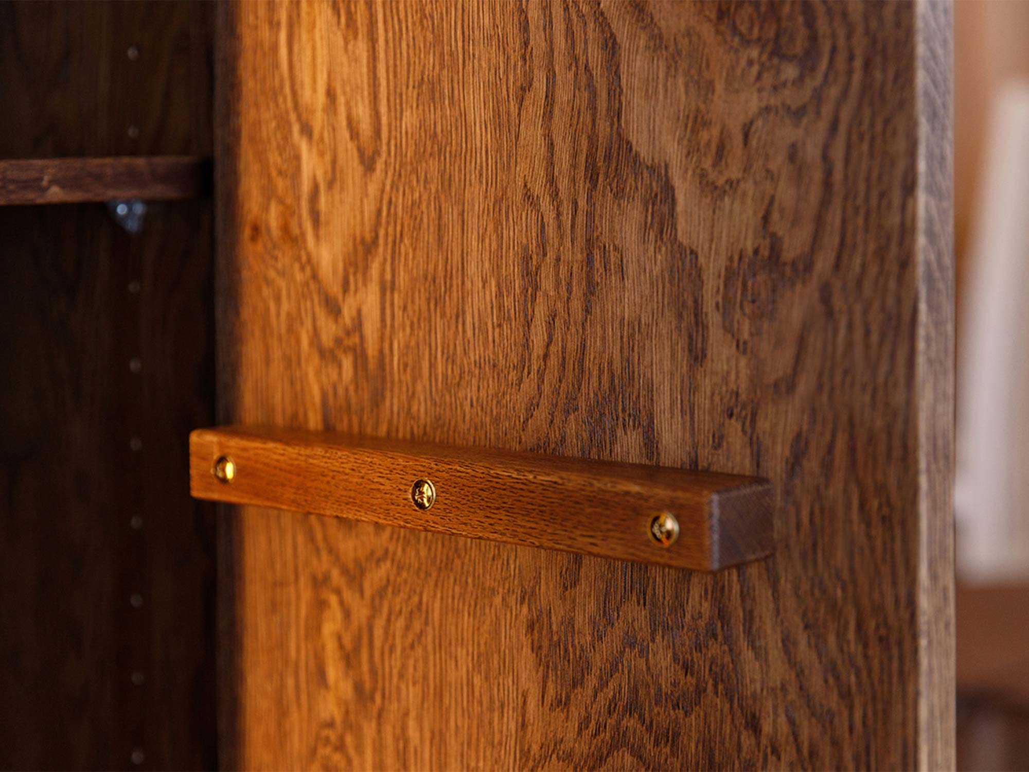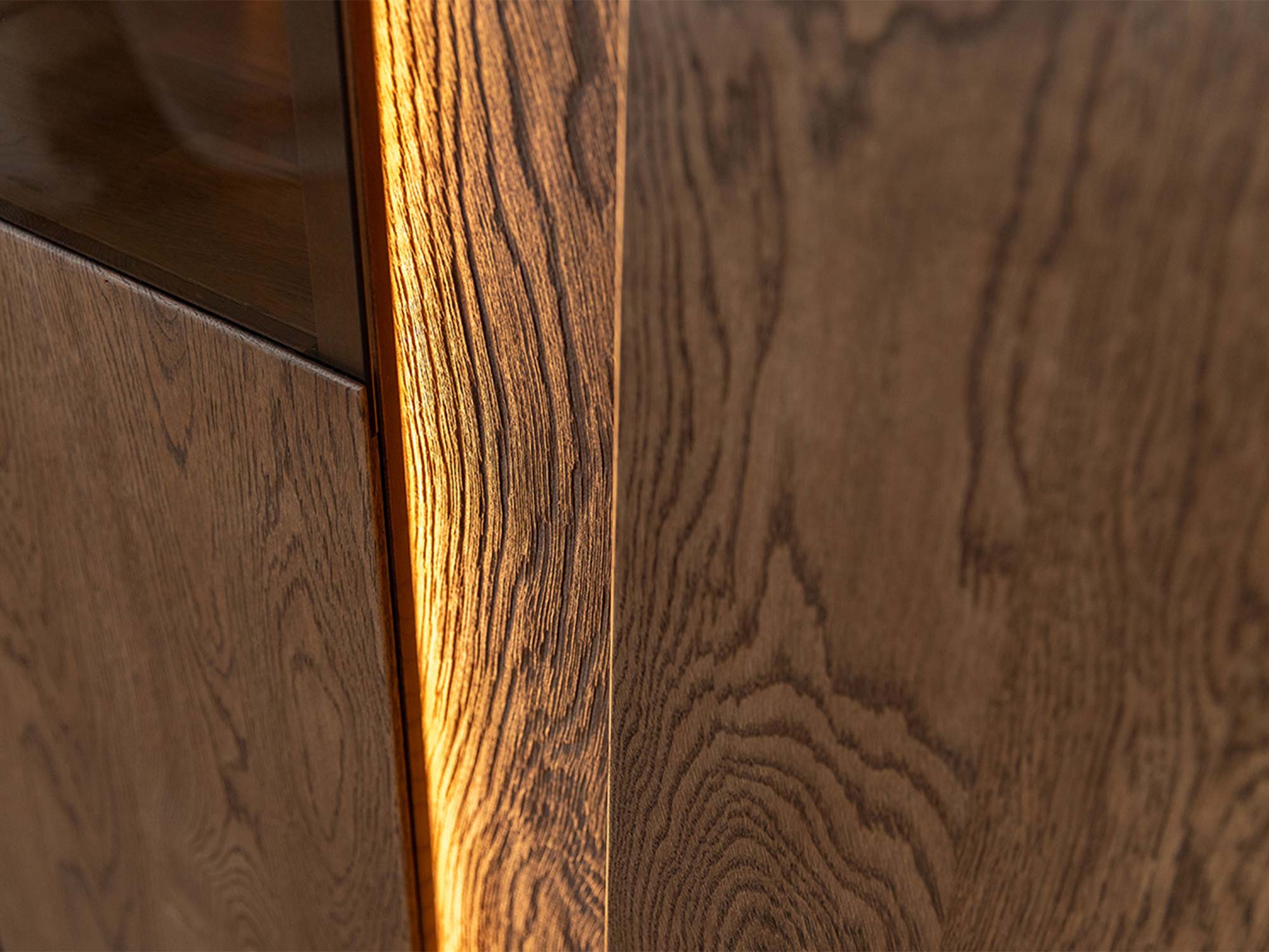 W kolekcji Essentia najważniejszy jest materiał. Lity dziki dąb zachwyca autentycznością: każdy słój i każdy sęk tworzy unikalny rysunek, więc Twoja witryna naprawdę będzie jedyna w swoim rodzaju. Olejowane wykończenie nadaje drewnu miękkości w dotyku, chroni powierzchnię i podkreśla głębię koloru tabacco. To rozwiązanie cenione w nowoczesnych wnętrzach — naturalne, eleganckie i długowieczne.