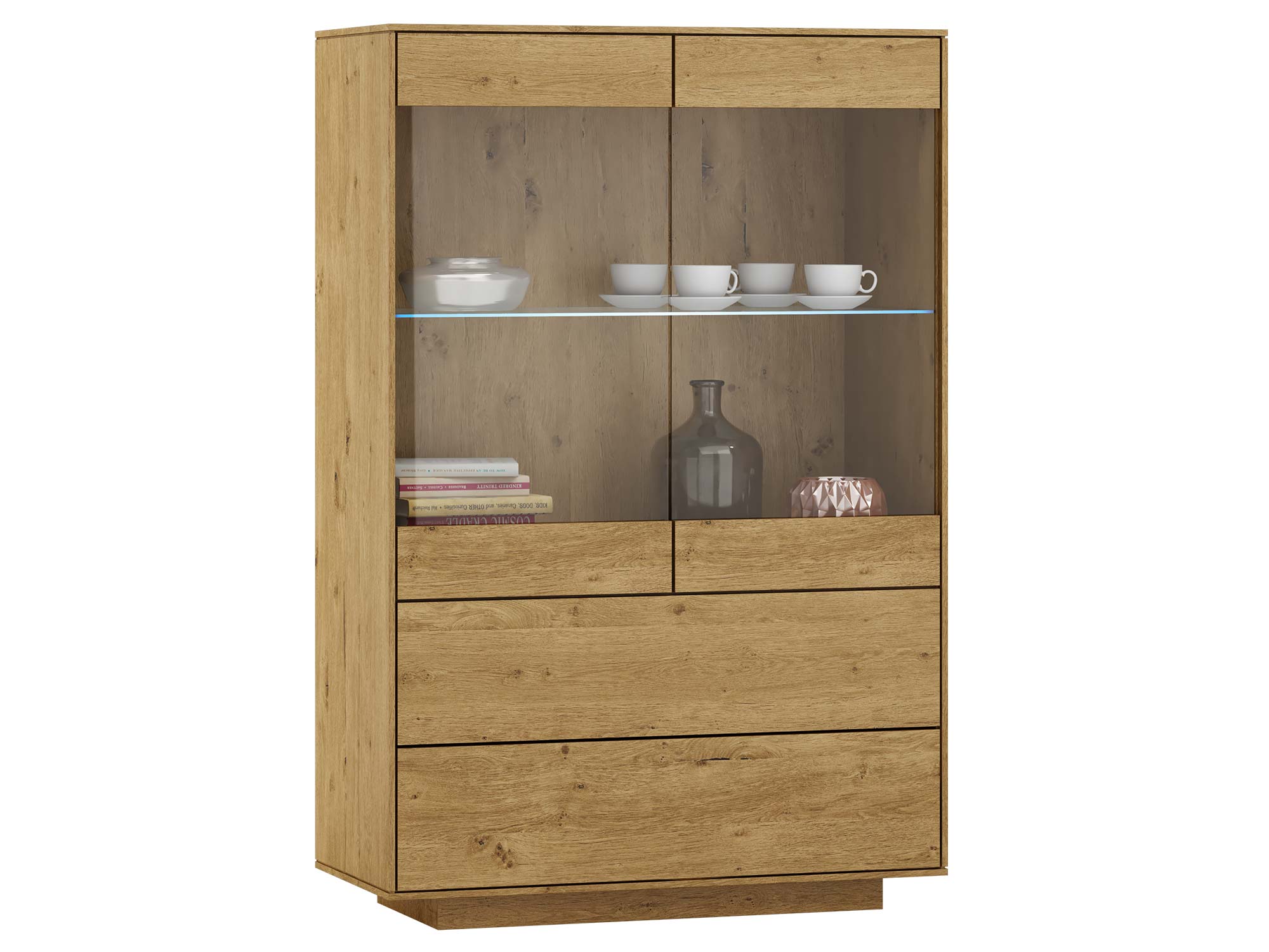 Naturalna okleina dębowa w kolorze dębu dzikiego sprawia, że każdy egzemplarz zachwyca indywidualnym charakterem. Niepowtarzalne słoje i subtelne przejścia kolorystyczne są dziełem natury, a ich piękno nadaje wnętrzu wyjątkowej autentyczności. To mebel, który nie tylko przechowuje, ale także dekoruje – dzięki przeszkleniu staje się elegancką ramą dla przedmiotów, które chcesz wyróżnić.