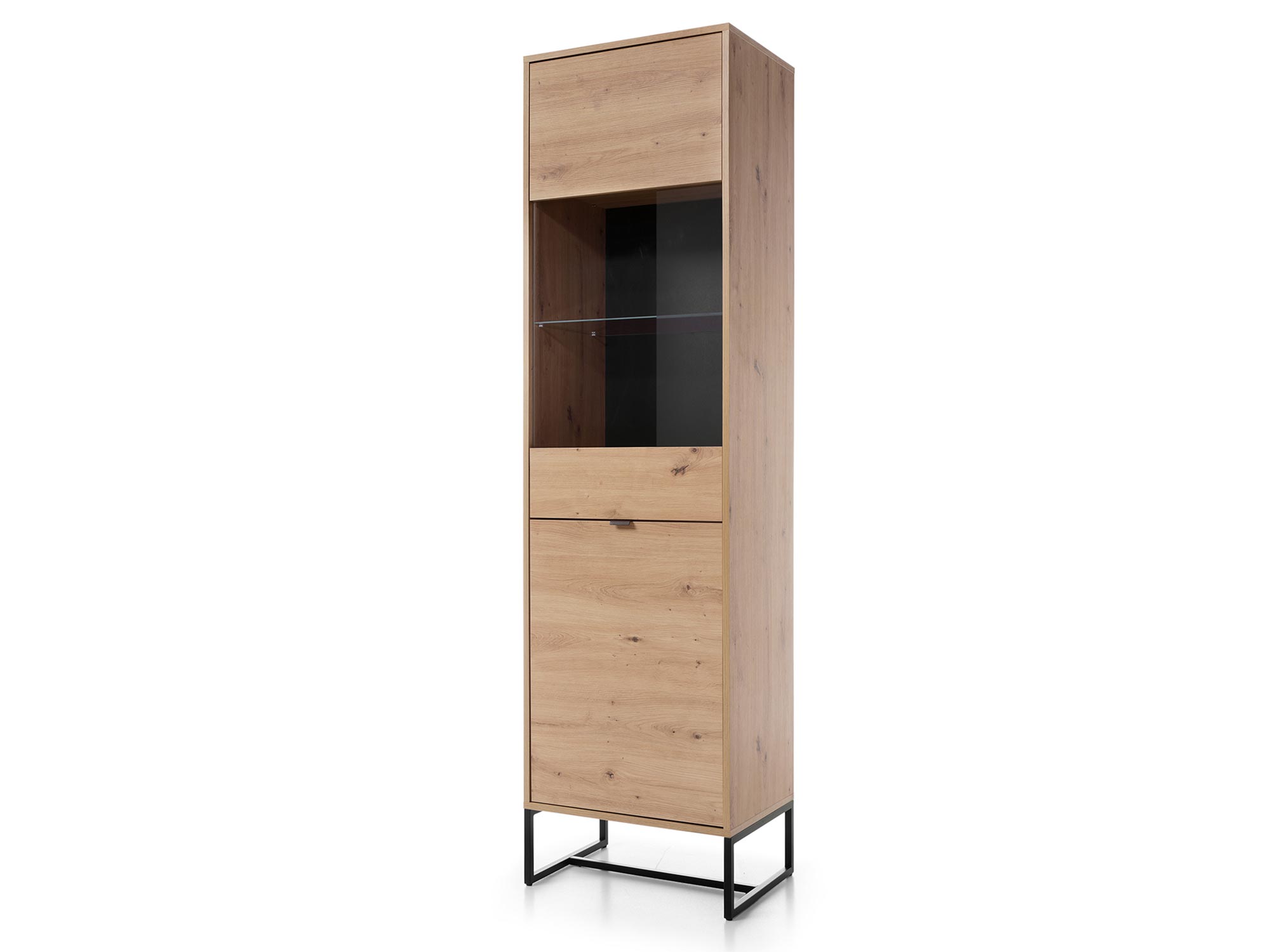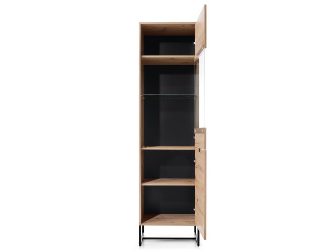 Witryna Bursztyn z Klasycznym Akcentem to doskonałe połączenie elegancji i funkcjonalności, które idealnie sprawdzi się w każdym nowoczesnym wnętrzu. Zaprojektowana z myślą o estetyce i wygodzie użytkowania, ta witryna wyróżnia się ciepłą fakturą dekoru Dąb Artisan, która wnosi do pomieszczenia przytulny, naturalny klimat. Czarny akcent podstawy oraz elegancki stalowy uchwyt dodają meblowi charakteru, czyniąc go doskonałym wyborem dla osób ceniących styl i jakość.