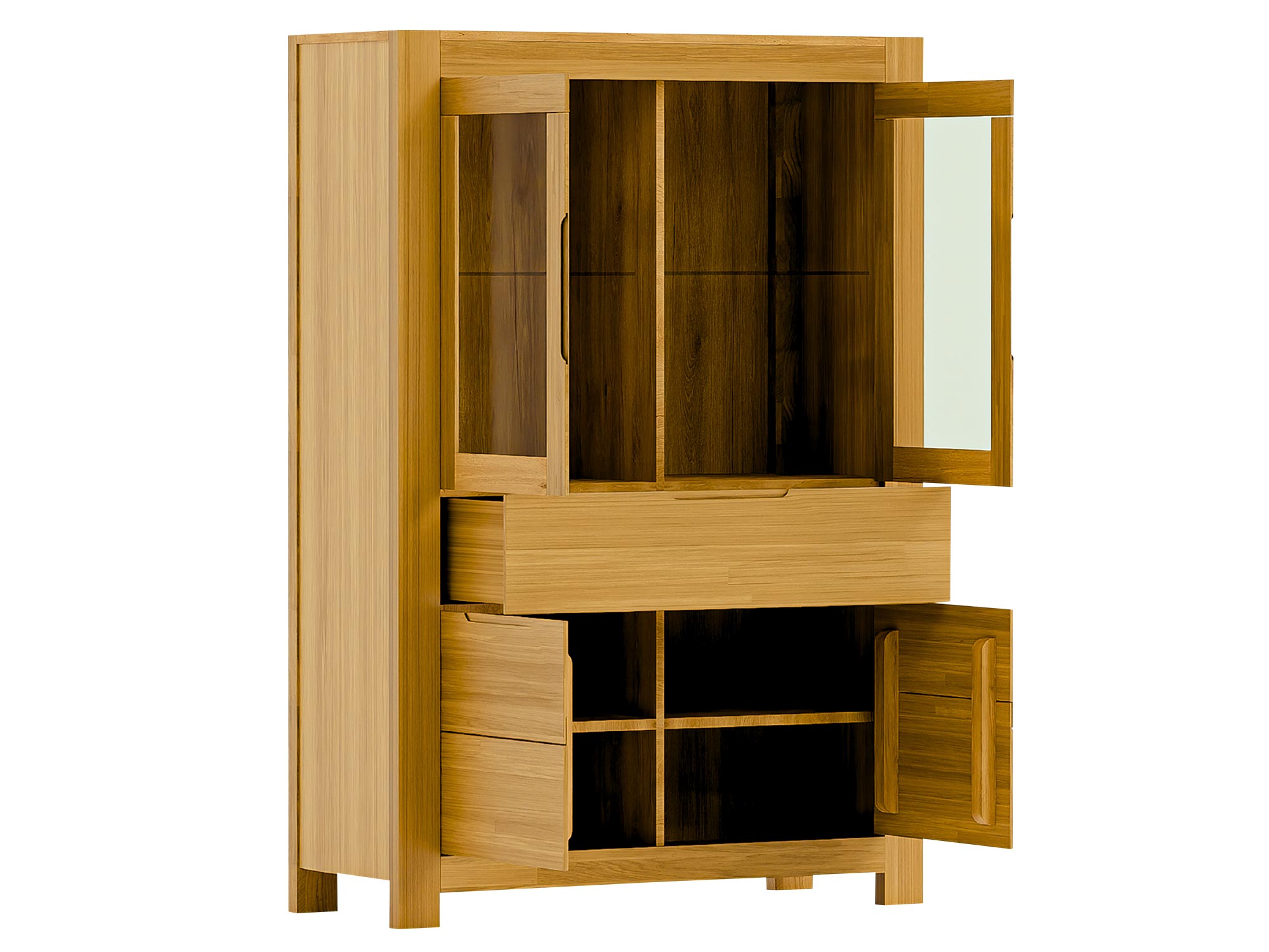 Boki i korpus wykonano z jakościowej płyty dębowej/forniru dębowego, perfekcyjnie dobranego kolorystycznie do frontów. Wnętrze zaprojektowano tak, by maksymalnie wykorzystać wysokość mebla: półki w części otwartej służą ekspozycji, a za pełnymi drzwiami zorganizujesz wszystko — od serwet i dokumentów po pudełka z akcesoriami. Lite dębowe nóżki nadają bryle lekkości, a zarazem gwarantują stabilność i prześwit ułatwiający utrzymanie porządku pod meblem.
