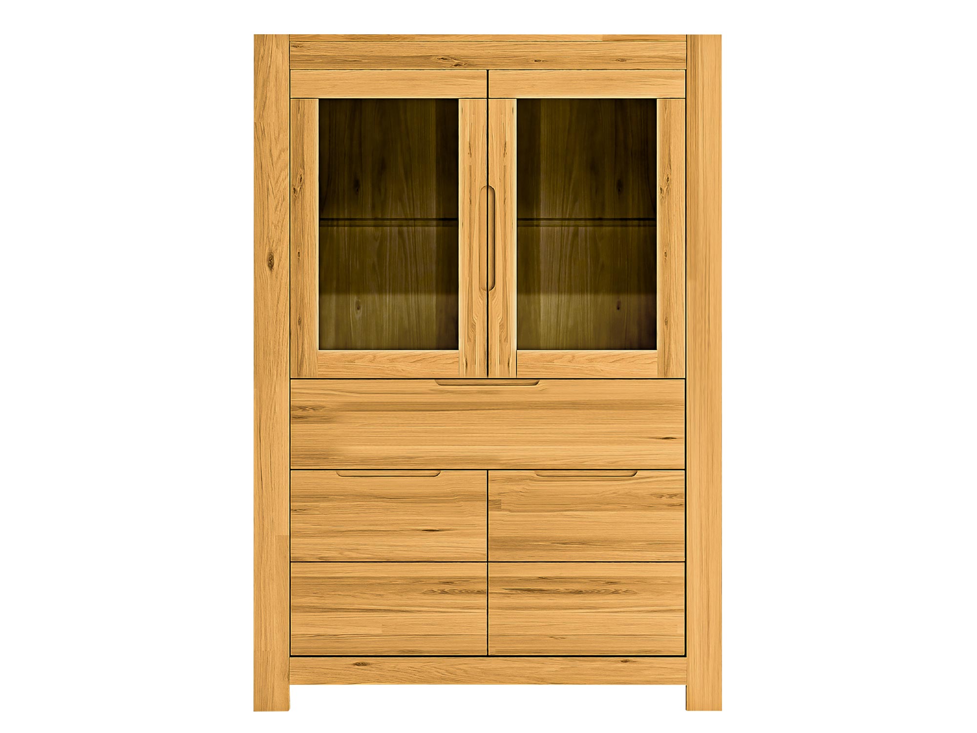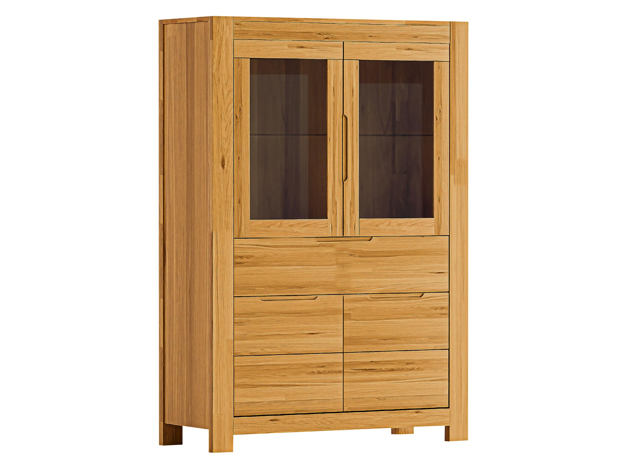 Lunaro 80 została zaprojektowana z myślą o harmonii pomiędzy estetyką a użytecznością. Fronty i blat wykonano z litego, olejowanego drewna dębowego, które zachwyca naturalnym rysunkiem słojów i złocistym wybarwieniem. To właśnie olejowanie wydobywa głębię koloru i chroni drewno przed codziennym użytkowaniem. Przeszklona część rozjaśnia bryłę i dodaje jej lekkości — idealna na porcelanę, szkło, pamiątki z podróży czy kolekcję książek w pięknych okładkach. Kontrast dla naturalnego dębu stanowią aluminiowe uchwyty w kolorze srebrnym — proste, smukłe i na wskroś nowoczesne.