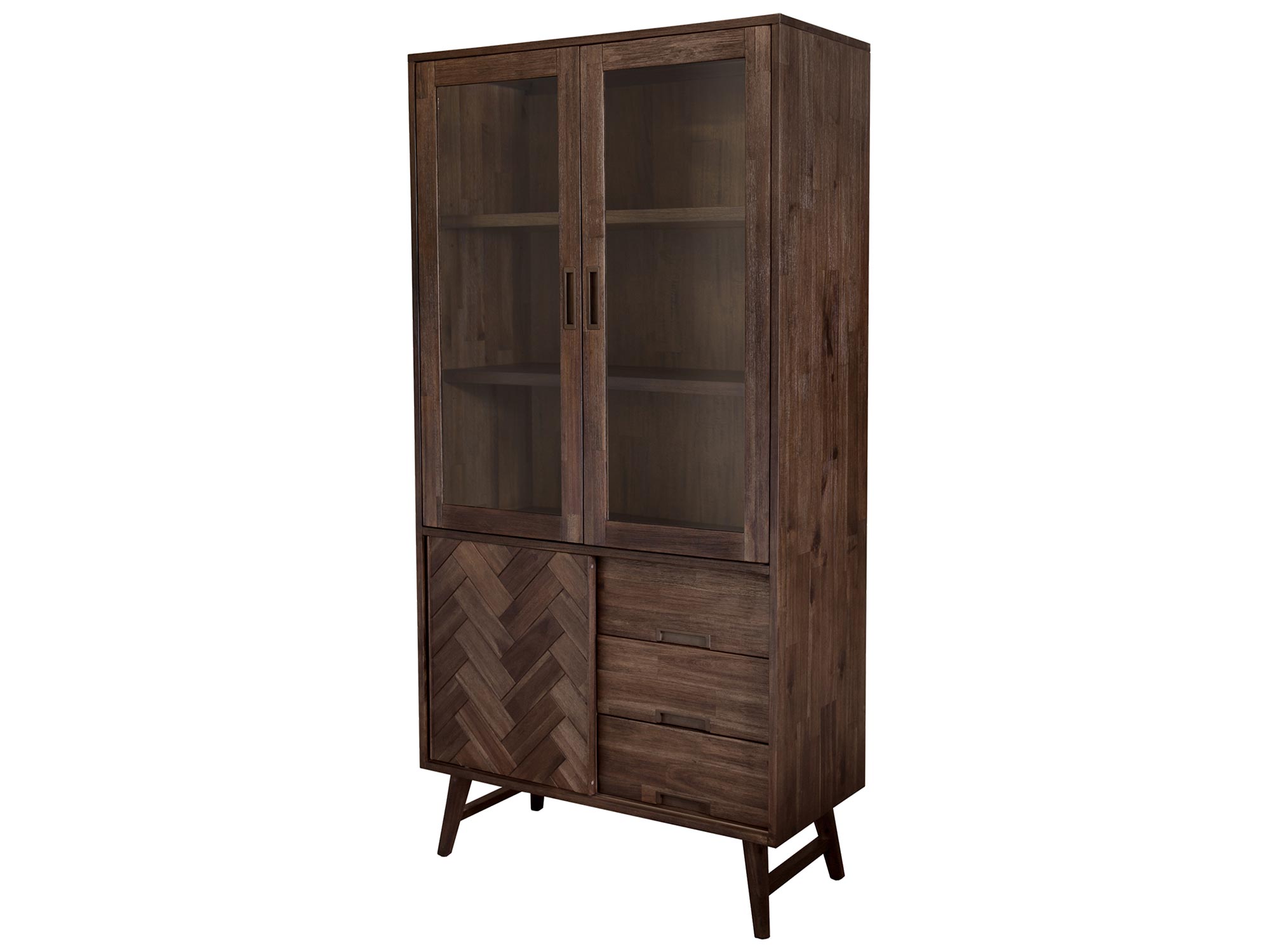 Witryna Willowbrook to elegancki mebel, który łączy w sobie klasyczny styl retro, vintage oraz boho. Wykonana z litego drewna akacji, w pięknym ciemnobrązowym odcieniu, z unikalnymi frontami z intarsją w jodełkę, nadaje pomieszczeniu niepowtarzalny charakter. Dzięki trzem pojemnym szufladom, dwóm regulowanym półkom i przesuwnym drzwiom, witryna zapewnia wygodne przechowywanie oraz stanowi wyjątkowy element dekoracyjny każdego wnętrza.