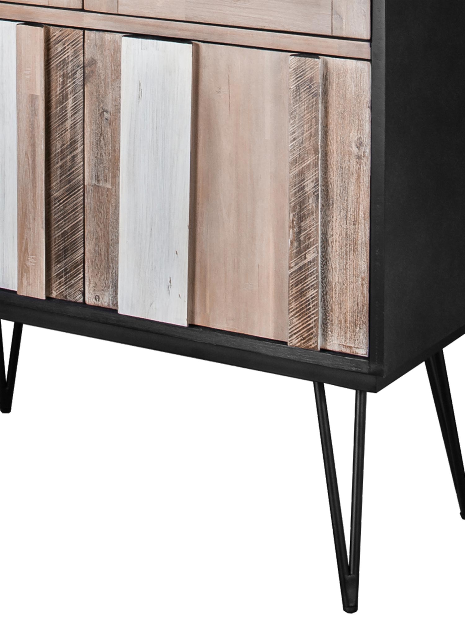 Witryna Mondo to propozycja dla osób szukających eleganckiego mebla o wyjątkowym charakterze. Wykonana z litego drewna akacji, charakteryzuje się różnorodnymi odcieniami w beżowych i szarych tonach. Fronty witryny są pokryte unikalną strukturą 3D, dzięki czemu każda witryna ma swój indywidualny charakter. Fronty pełnią także funkcję uchwytów, co dodatkowo podkreśla minimalistyczny, ale i funkcjonalny design mebla. Metalowe nogi w kolorze czarnym zapewniają stabilność oraz nowoczesny akcent, który pasuje do różnych stylów wnętrz.