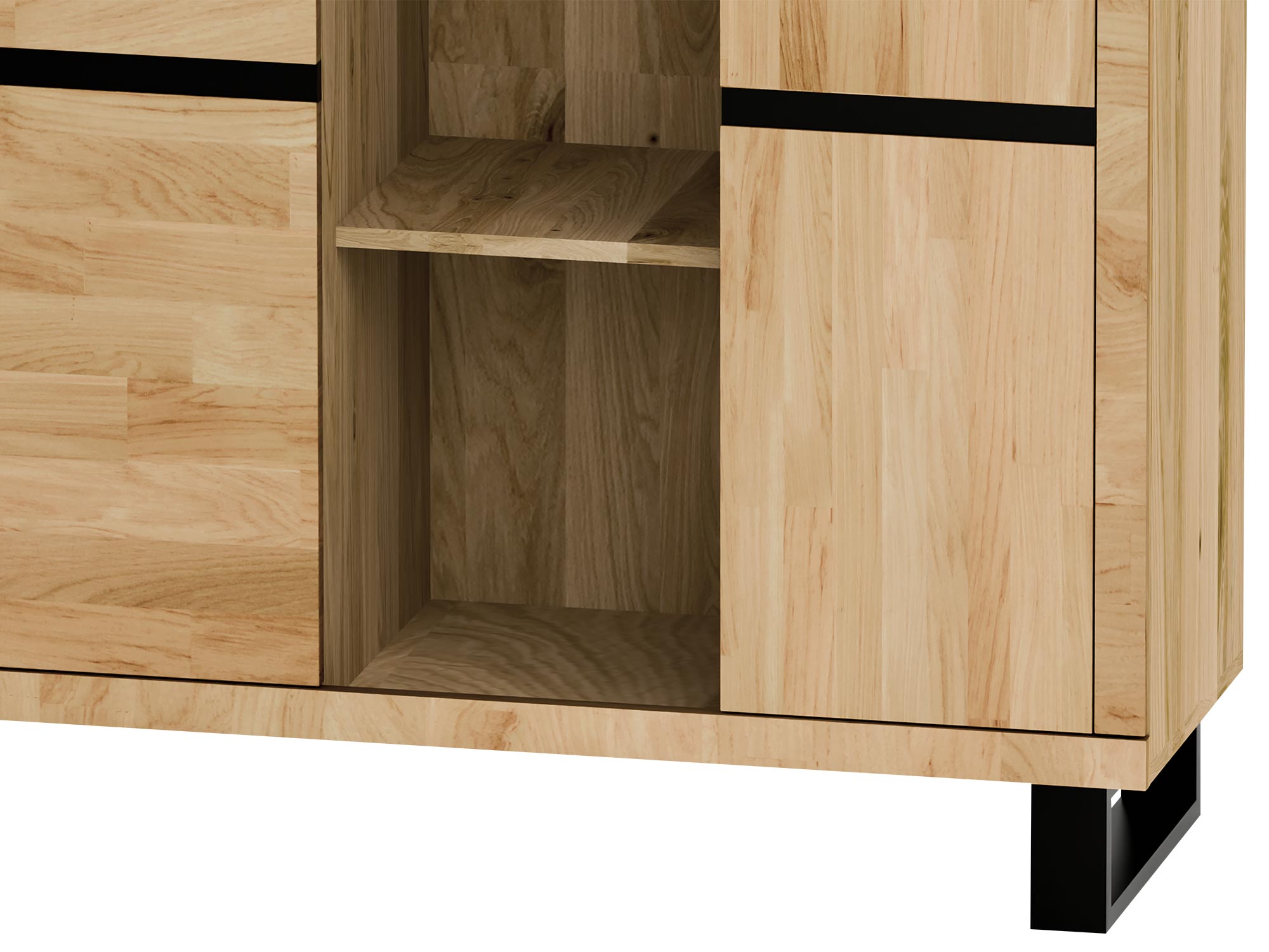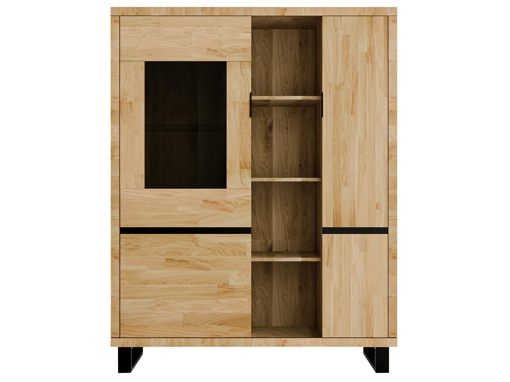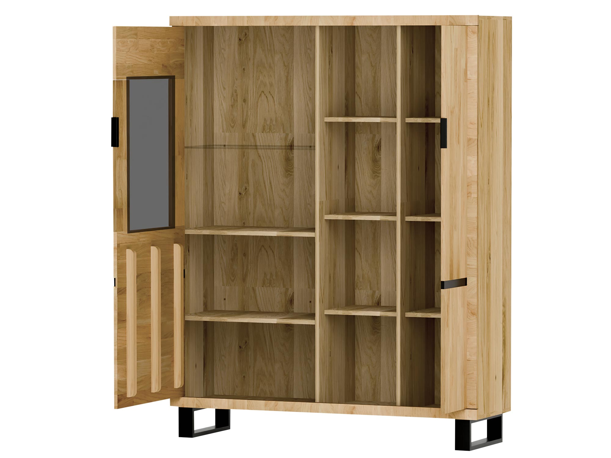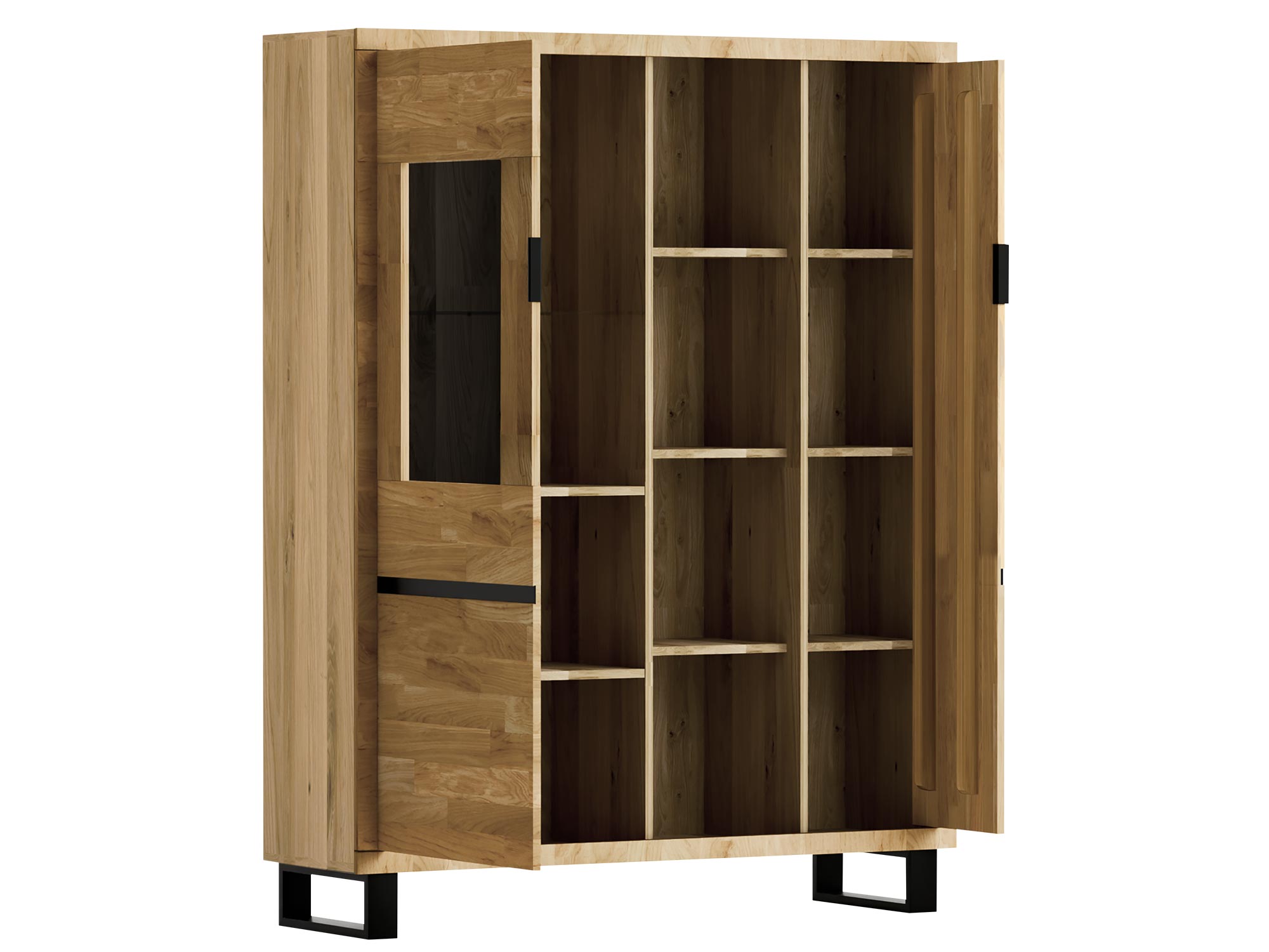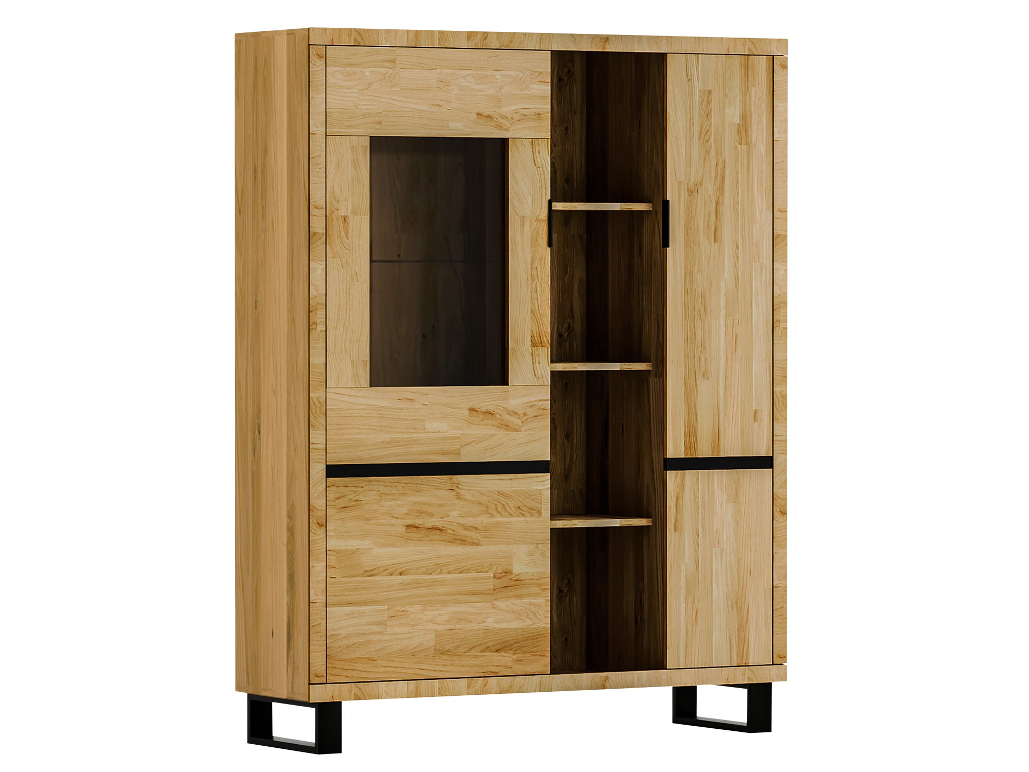 Witryna Drewniana Loftowa – Nexor 07 zachwyca unikalnym designem i jakością wykonania. Fronty z litego, olejowanego drewna dębowego z przeszkleniem idealnie eksponują zawartość mebla, a nowoczesne, czarne uchwyty i metalowe nogi dodają meblowi charakteru. Korpus mebla, czyli blat, boki i wnętrze, wykonany jest z wytrzymałej płyty laminowanej o strukturze dopasowanej do koloru frontów.