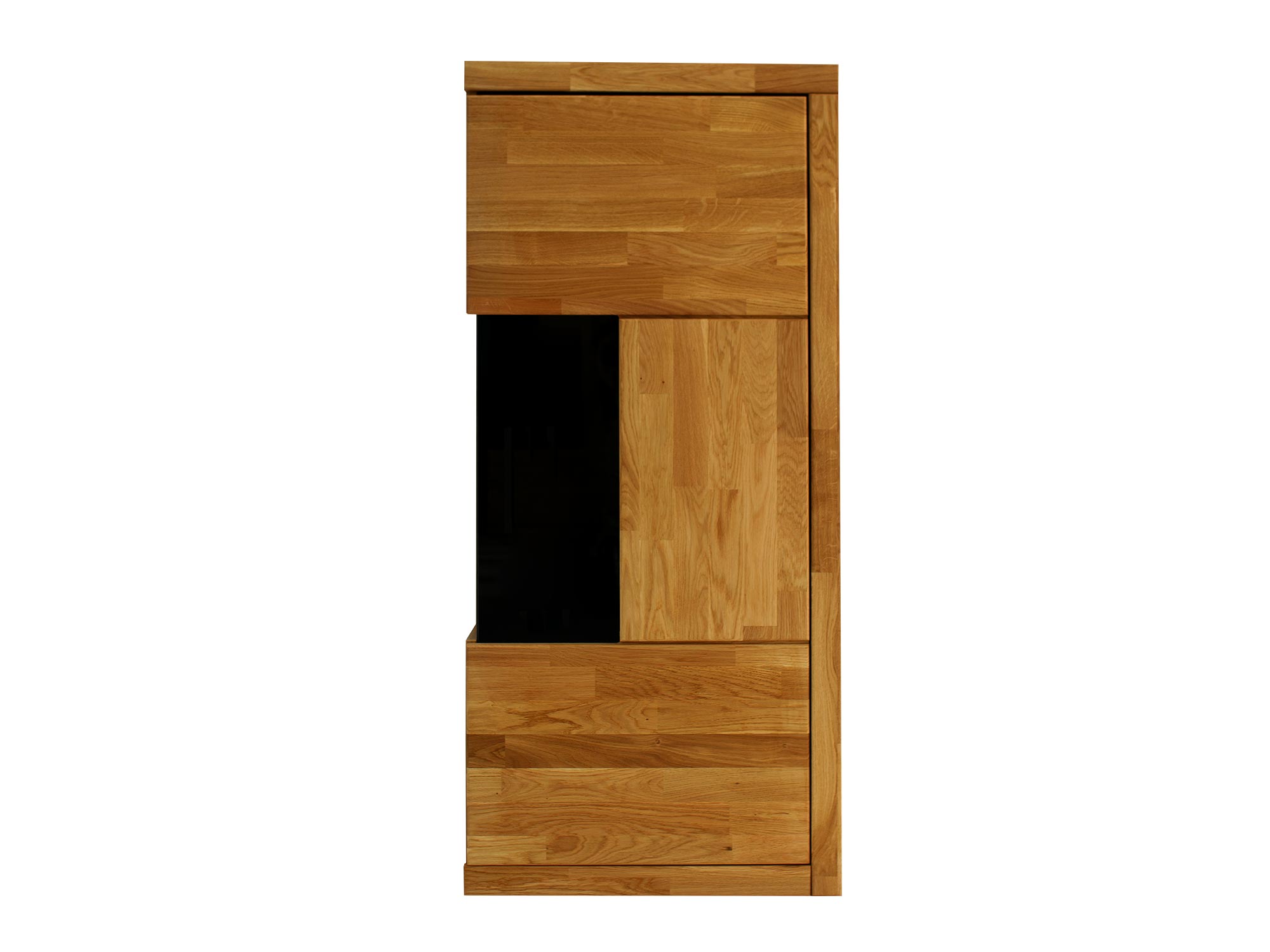 Front Avero 95 wykonano z olejowanego drewna dębowego, które zachwyca naturalnym usłojeniem i złocistą barwą. Wkomponowane przyciemniane szkło hartowane dodaje lekkości i nuty nowoczesności, a jednocześnie dyskretnie porządkuje to, co chcesz wyeksponować: porcelanę, pamiątki z podróży, ulubione świece czy książki artystyczne. Korpus — blat, boki i wnętrze — to laminat ze strukturą 3D, dopasowany kolorystycznie do dębu: wygląda jak drewno, lecz jest odporny na ślady codziennego użytkowania i łatwy w czyszczeniu.