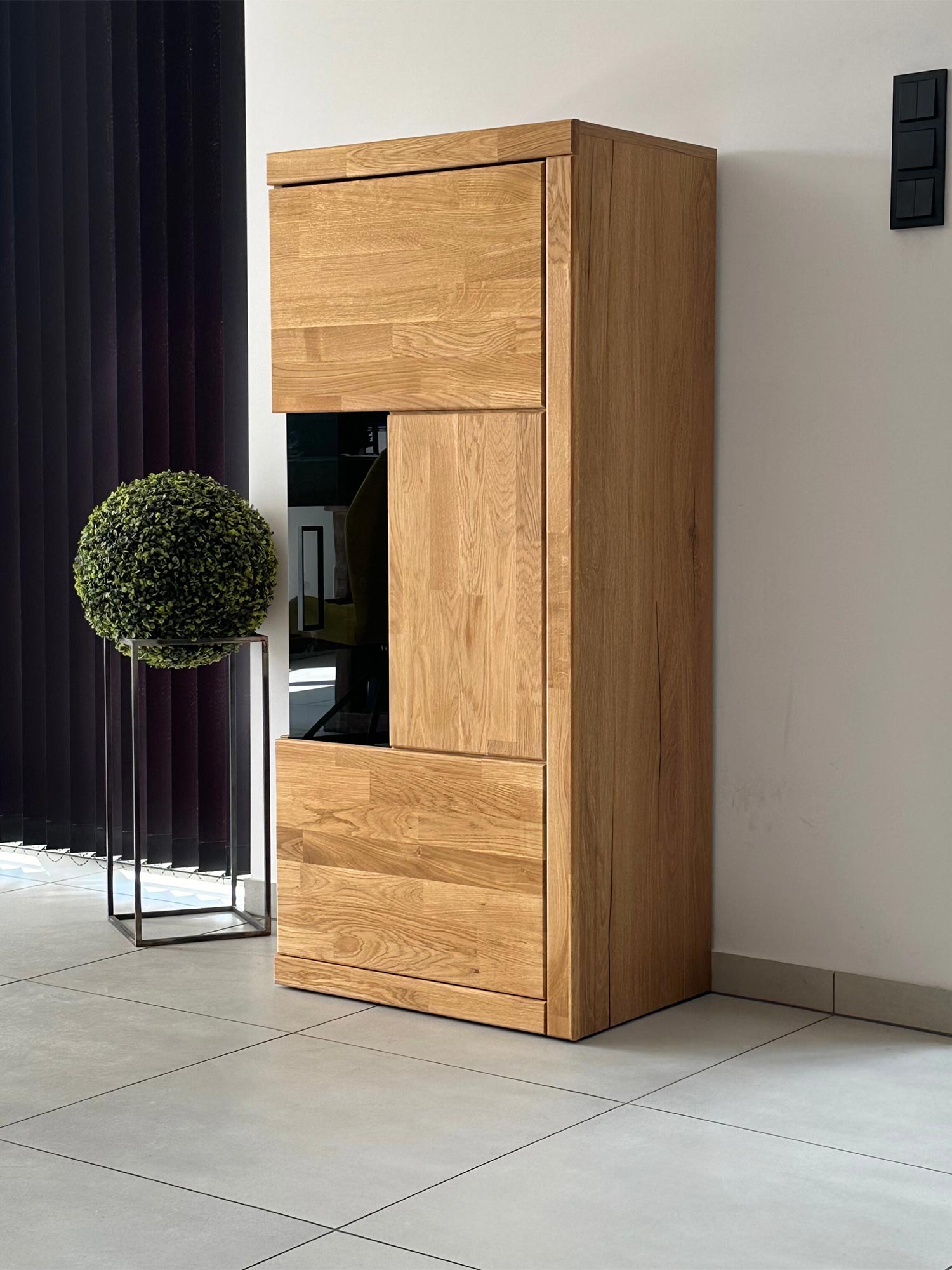 Witryna Niska Drewniana Szklana – Avero 95 łączy to, co najważniejsze: piękno naturalnego dębu, elegancję szkła i praktyczność mądrze zaprojektowanego wnętrza. Jej kompaktowe wymiary czynią ją idealnym wyborem do mieszkań, w których liczy się każdy centymetr, a jednocześnie nie chcesz rezygnować z designu i porządku. Jeśli marzysz o scenie dla swoich ulubionych przedmiotów i meblu, który „robi robotę”, ta witryna spełni Twoje oczekiwania.