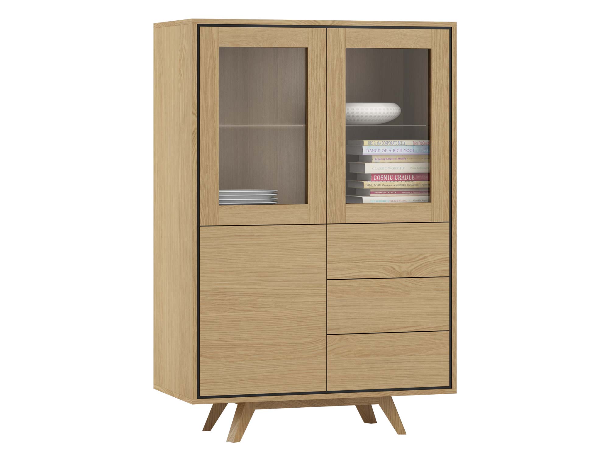 Nowoczesna witryna niska Saviero została zaprojektowana z myślą o osobach, które pragną wprowadzić do wnętrza harmonię, porządek i odrobinę designerskiego charakteru. Jej prosta forma została wzbogacona o detale, które przyciągają uwagę – skośne nogi z litego drewna dębowego nadają bryle lekkości, a kontrastujące czarne wstawki podkreślają geometryczną linię mebla. To mebel, który zachwyci Cię zarówno na co dzień, jak i podczas wyjątkowych okazji, stając się centralnym punktem aranżacji.
