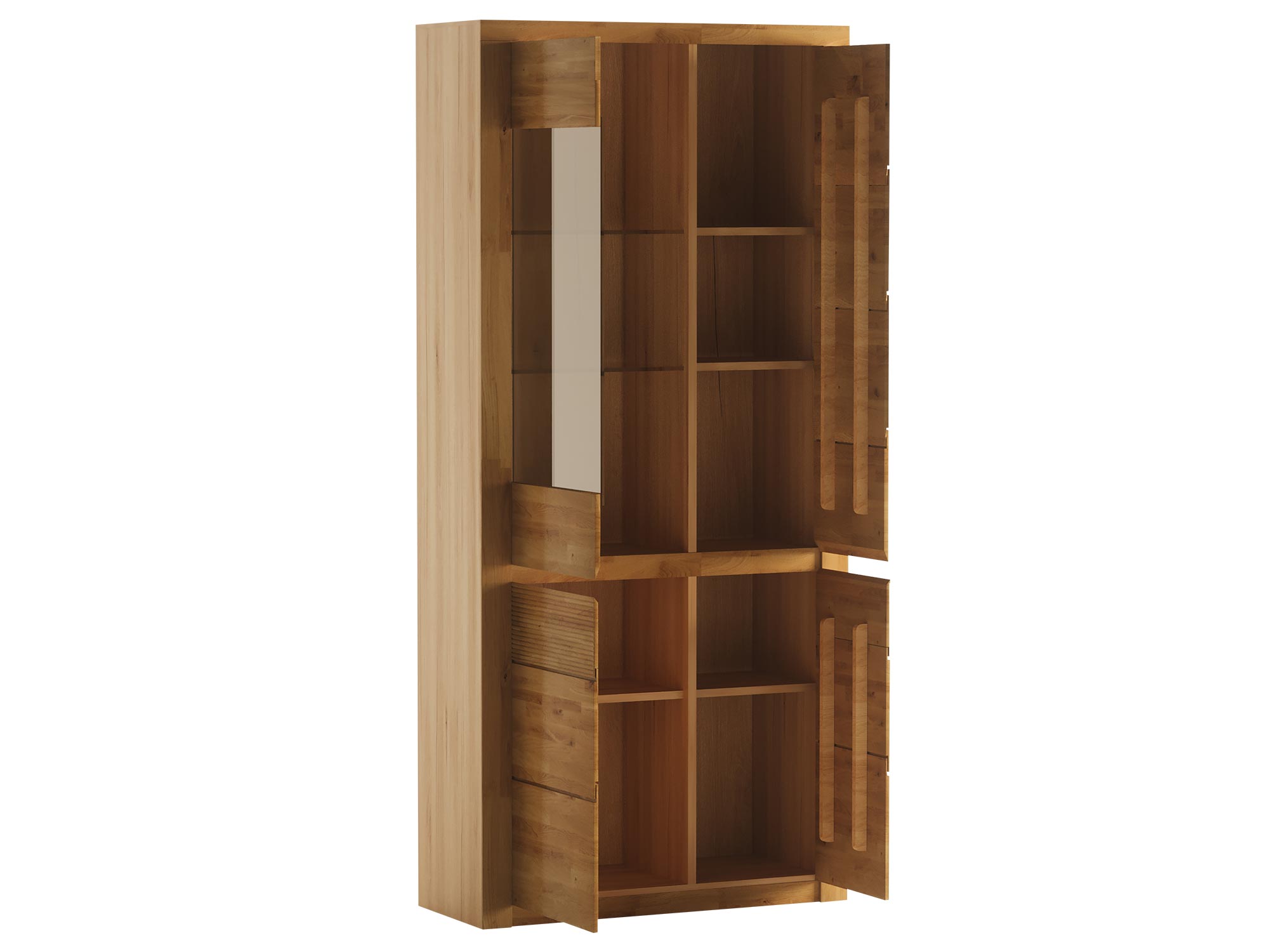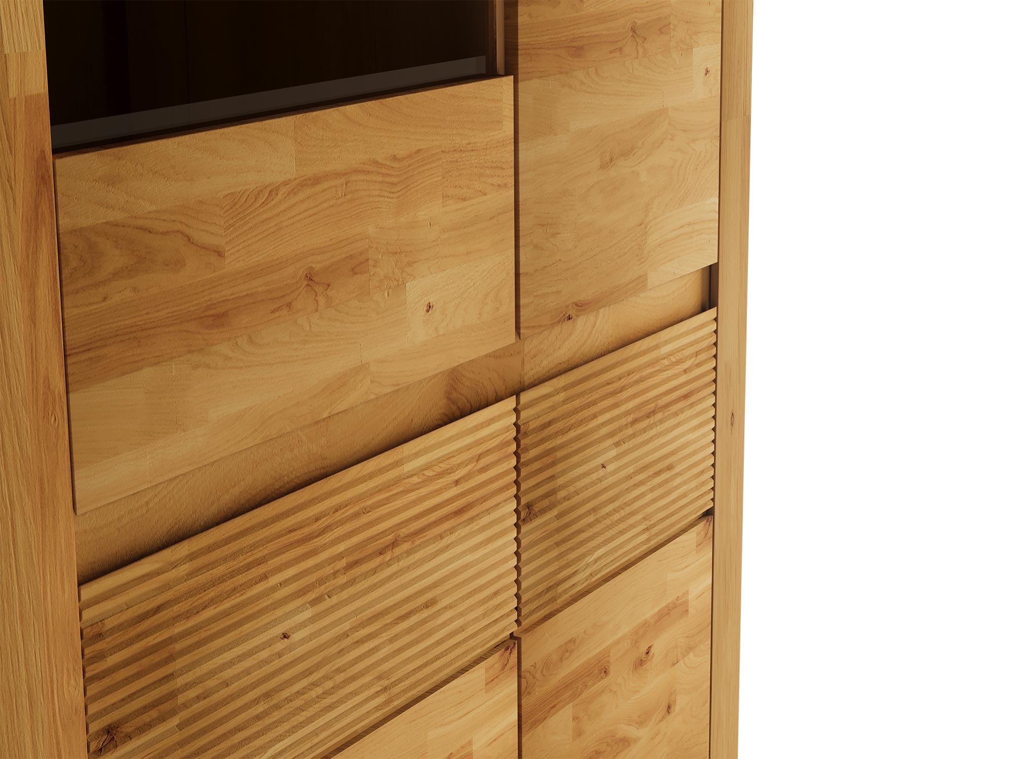 Rozkład funkcji jest intuicyjny: cztery drzwitrzy pełne i jedne przeszklone – porządkują przechowywanie. W strefie ekspozycji pracują wytrzymałe półki szklane, które nadają wnętrzu lekkość, a jednocześnie utrzymują nienaganny porządek. Półki w częściach zamkniętych pozwalają wygodnie rozlokować tekstylia, dokumenty, zastawę lub drobną elektronikę. Frezowane uchwyty w litym drewnie są wygodne, nie psują geometrycznej linii i nie konkurują ze słojem dębu.