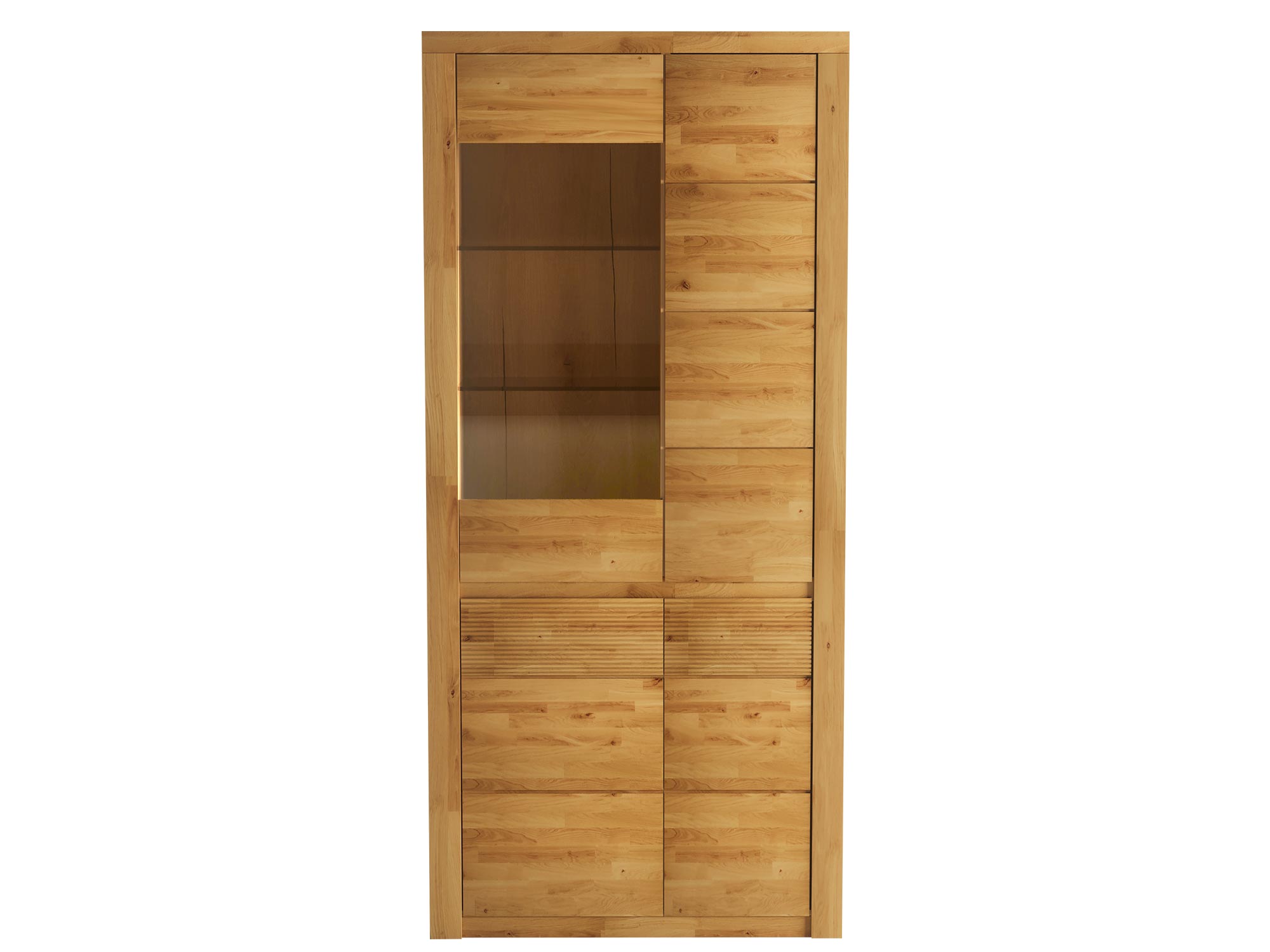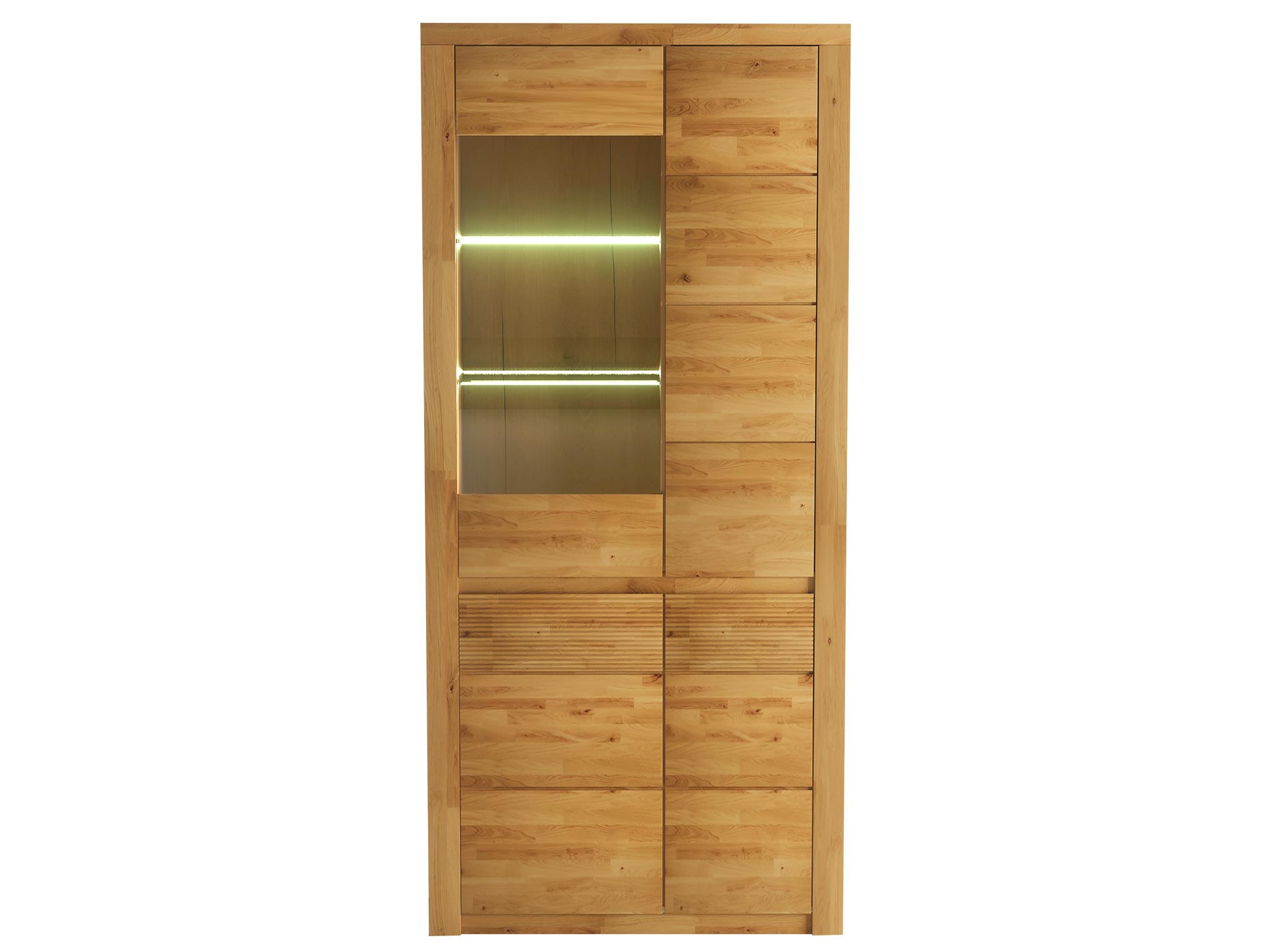 Fronty wykonane z litego, olejowanego drewna dębowego emanują naturalnym rysunkiem słojów, a korpus z laminowanej płyty 3D wiernie odwzorowuje fakturę dębu, zwiększając odporność na ślady użytkowania. W centralnej, przeszklonej części znajdziesz szklane półki – idealne na szkło, ceramikę czy kolekcje, które zasługują na własną scenę. Po bokach i poniżej – przestrzeń za drzwiami pełnymi, która utrzymuje ład w salonie, jadalni lub domowym biurze.