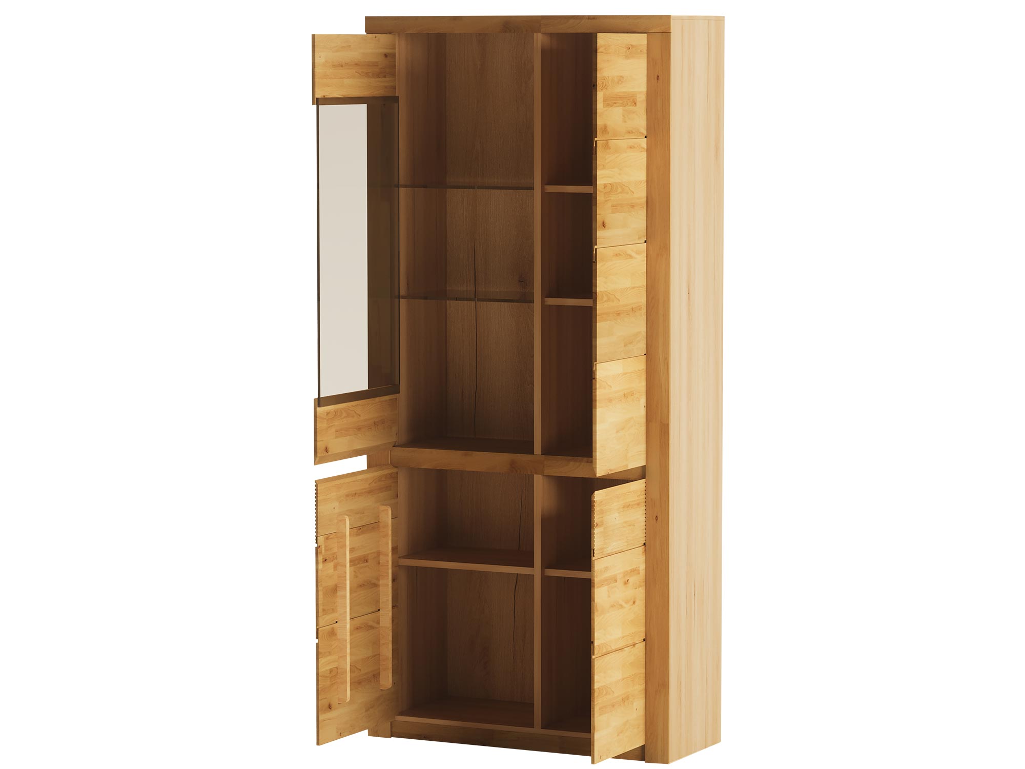 Fronty wykonane z litego, olejowanego drewna dębowego emanują naturalnym rysunkiem słojów, a korpus z laminowanej płyty 3D wiernie odwzorowuje fakturę dębu, zwiększając odporność na ślady użytkowania. W centralnej, przeszklonej części znajdziesz szklane półki – idealne na szkło, ceramikę czy kolekcje, które zasługują na własną scenę. Po bokach i poniżej – przestrzeń za drzwiami pełnymi, która utrzymuje ład w salonie, jadalni lub domowym biurze.