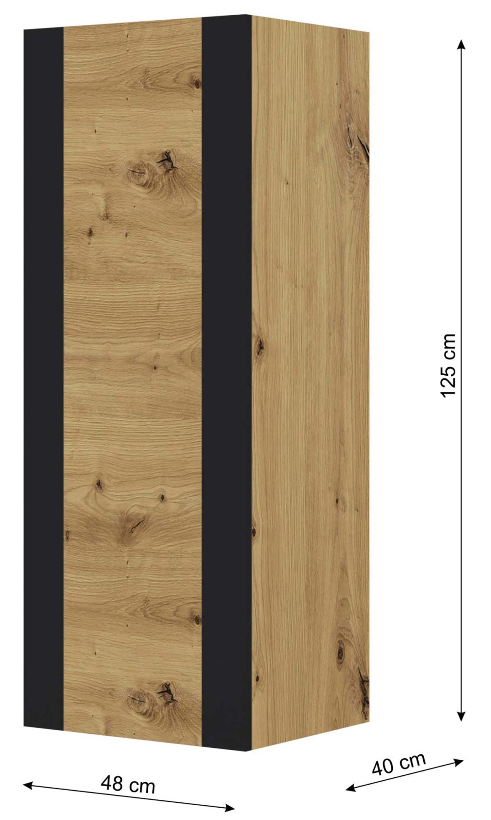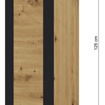 Za pełnymi drzwiami znajdują się trzy przestronne półki, które pomogą Ci zorganizować przestrzeń według własnych potrzeb. Brak przeszkleń? To świadomy wybór – bo to Ty decydujesz, co chcesz ukryć, a co pokazać. Minimalistyczna forma mebla wpisuje się we współczesne trendy, a jego wykończenie w kolorze dąb artisan dodaje wnętrzu przytulności.