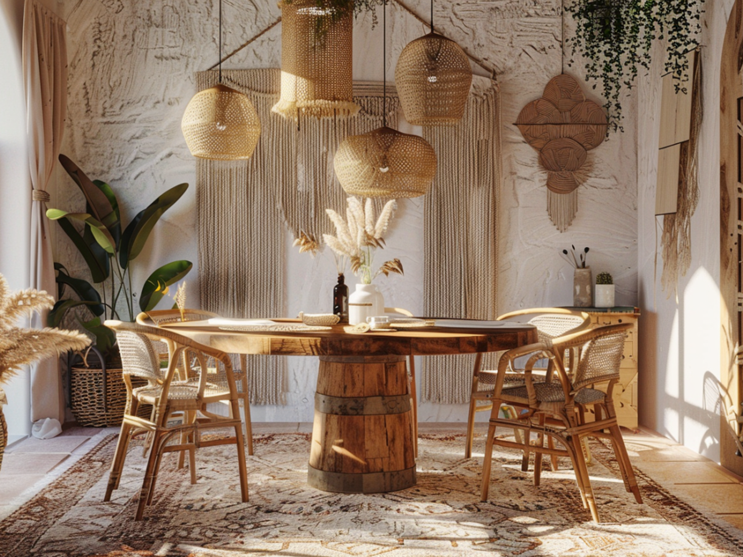 Eklektyczne aranżacje łączą elementy różnych stylów, tworząc wnętrza pełne charakteru i osobowości. Stół w kształcie beczki może być w takim przypadku centralnym punktem, który łączy tradycję z nowoczesnością. Połączenie klasycznego wyglądu stołu z kolorowymi krzesłami, oryginalnymi dywanami i dekoracyjnymi dodatkami w stylu boho tworzy przestrzeń pełną energii i inspiracji.