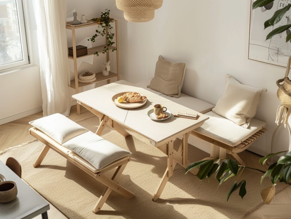 W małych mieszkaniach każdy centymetr jest na wagę złota. Stoły ze zintegrowaną ławą pozwalają na: