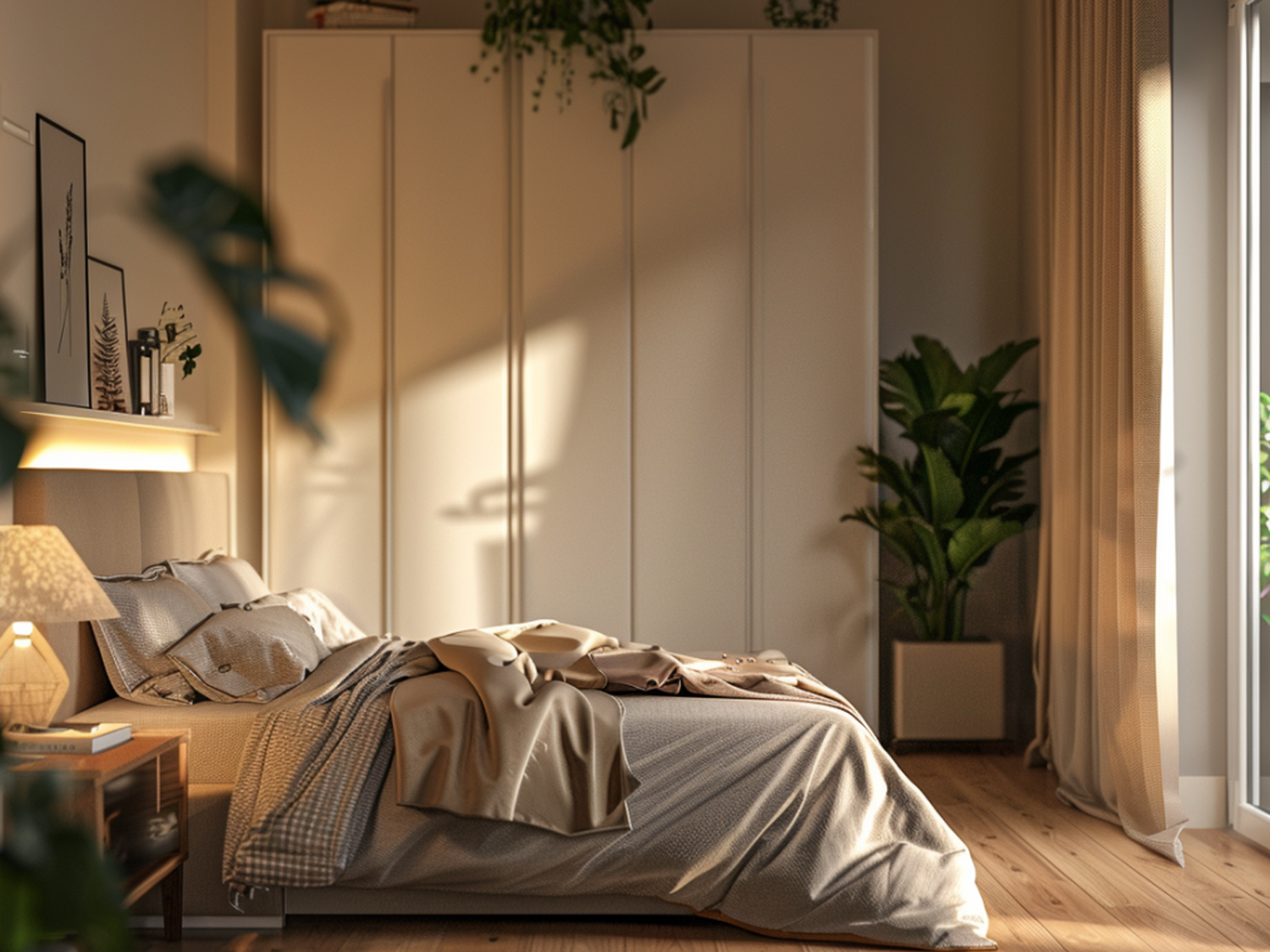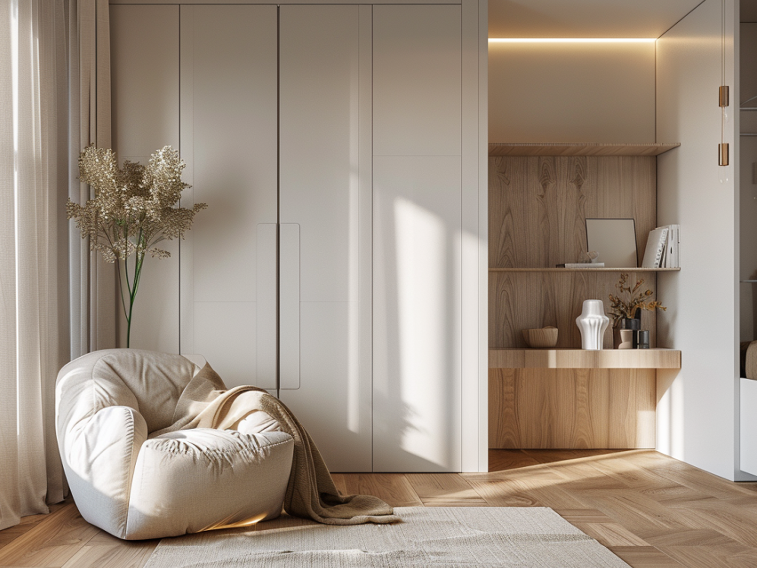 W nowoczesnych aranżacjach salonu szafa z drzwiami składanymi może stać się centralnym elementem, który optymalnie wykorzystuje przestrzeń i dodaje wnętrzu elegancji. Umieszczona w rogu pomieszczenia, integruje się z innymi meblami, takimi jak sofy i stoliki kawowe, tworząc spójną strefę wypoczynkową. Jasne wykończenie mebla i dyskretny mechanizm składania sprawiają, że całość prezentuje się czysto i nowocześnie.